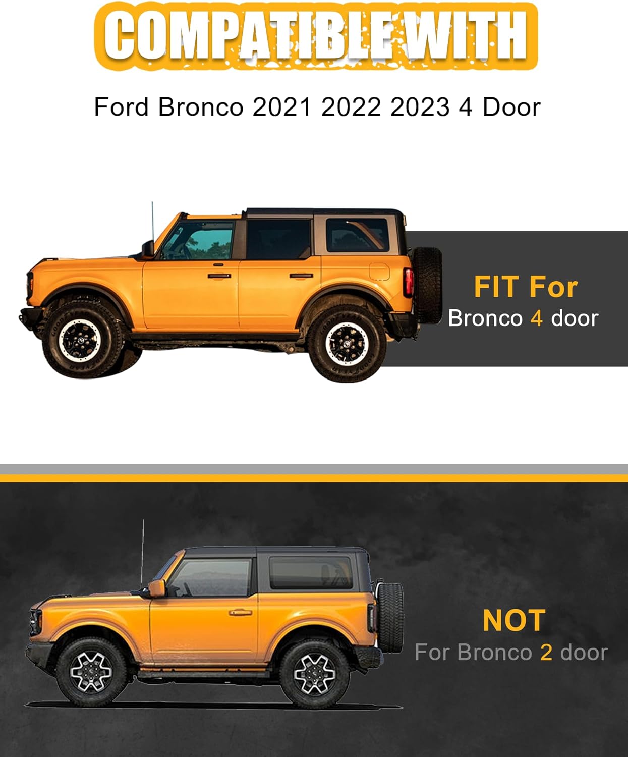 - COMPACTIBILITY: Pinch weld covers fit for Ford Bronco 4-Doors 6th Gen. 2021 2022 2023 2024, does NOT fit the Bronco Sport.
