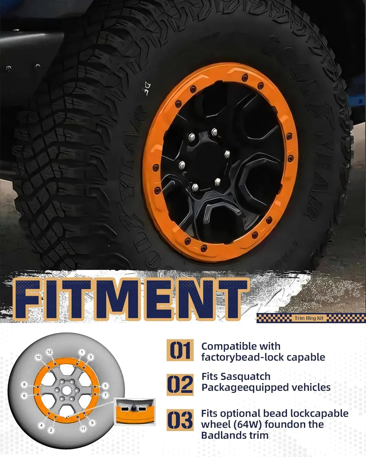 - COMPATIBILITY: Bead Lock Trim Ring Kit Fit for 2021-2024 Ford Bronco Sasquatch(675) and Badlands(64W) trim package with factory beadlock capable wheels.