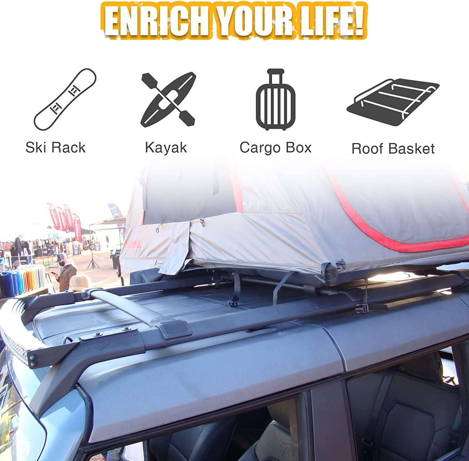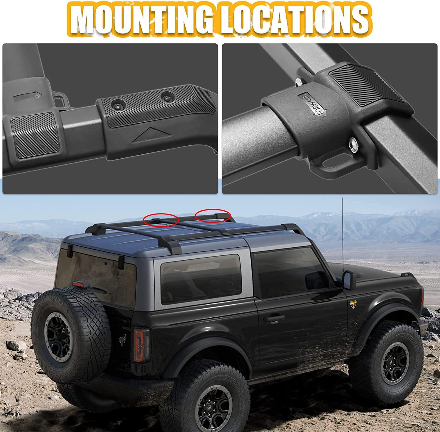 • PRECISE FIT: The cross bars fit for 2021 2022 2023 2024 2025 FORD BRONCO 2-Door and 4-Door. (Make Sure Your Bronco is Equipped with Original ROOF RAILS). Not for Bronco Raptor model, Bronco Sport.