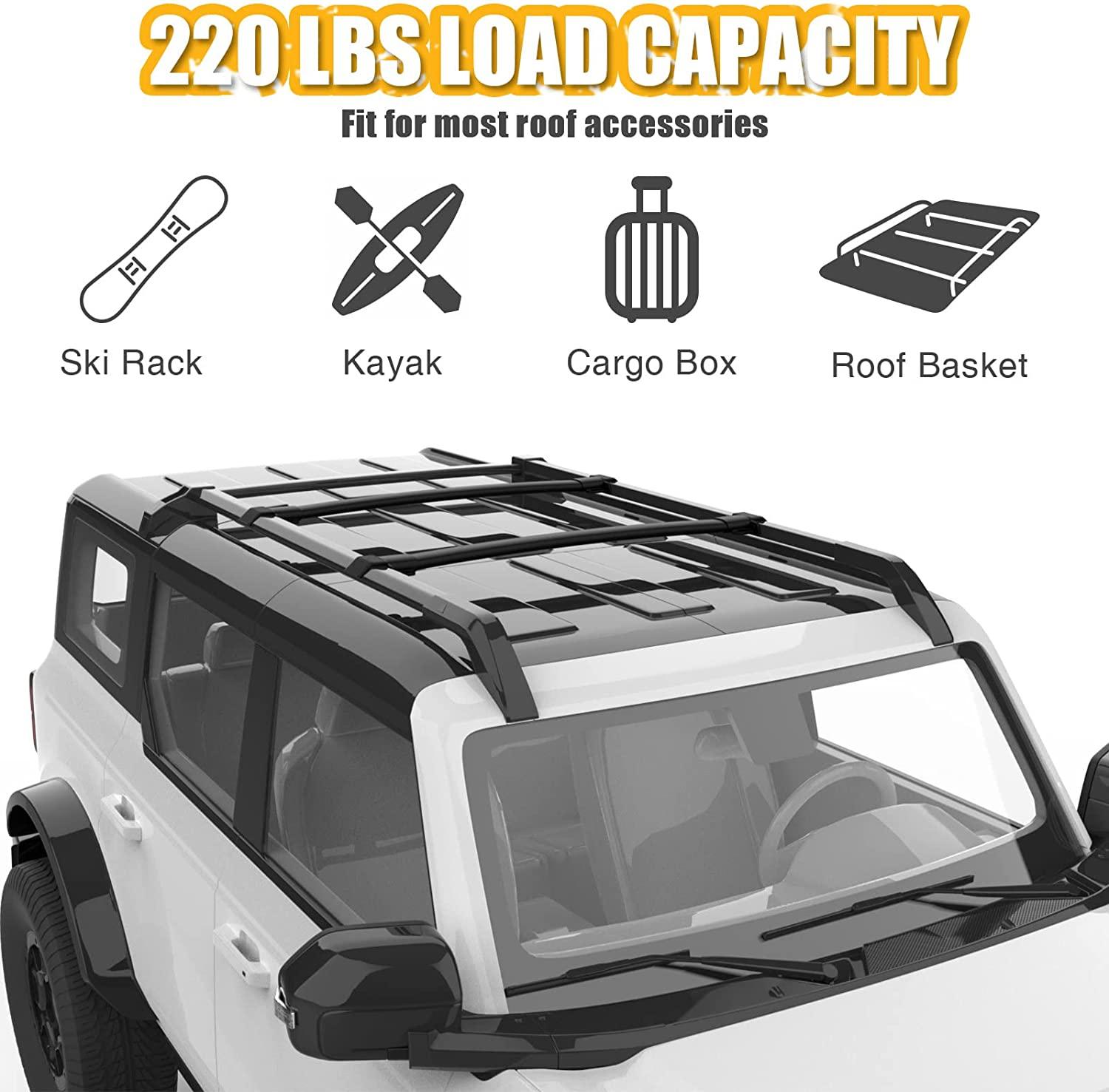 Aerodynamic design helps reduce wind noise. Supports typical Bronco roof rack weight limit.
