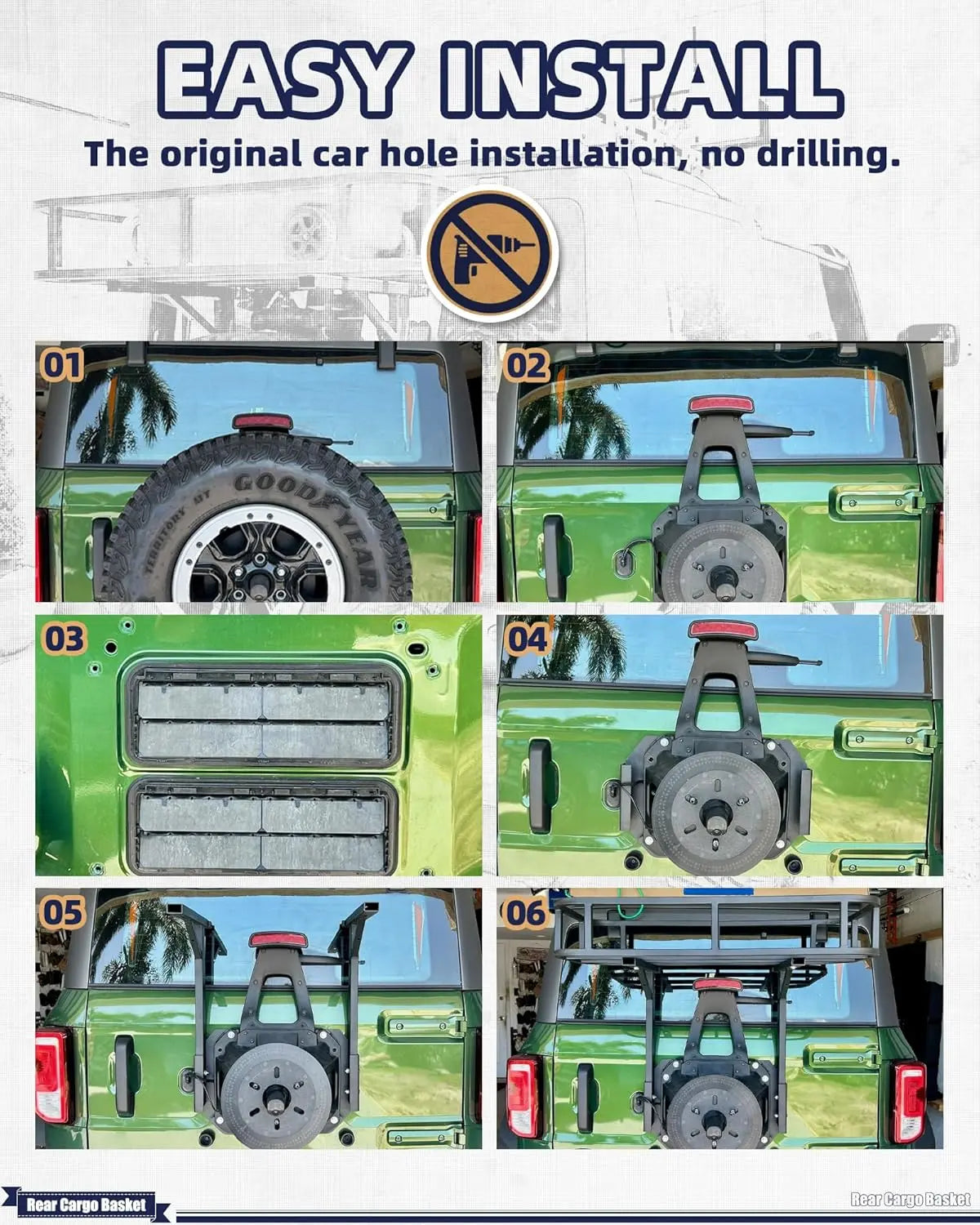 • Easy Install: Mount to the holes of the Bronco Tailgate. No drilling is required.